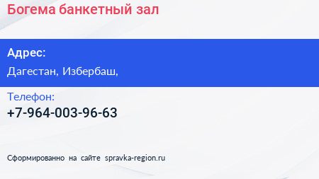 Богема, банкетный зал по адресу Дагестан, Избербаш, в дальнейшем Организация, размещена в следующих категориях: