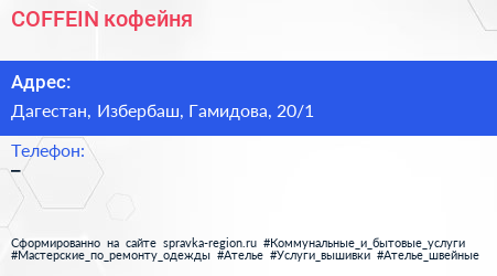 COFFEIN, кофейня по адресу Дагестан, Избербаш, Гамидова, 20/1 в дальнейшем Организация, размещена в следующих категориях: