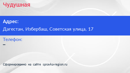 Чудушная по адресу Дагестан, Избербаш, Советская улица, 17 в дальнейшем Организация, размещена в следующих категориях: