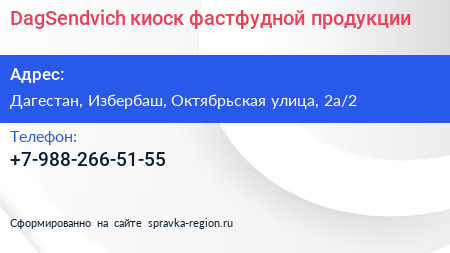 DagSendvich, киоск фастфудной продукции по адресу Дагестан, Избербаш, Октябрьская улица, 2а/2 в дальнейшем Организация, размещена в следующих категориях: