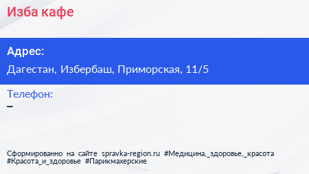 Изба, кафе по адресу Дагестан, Избербаш, Приморская, 11/5 в дальнейшем Организация, размещена в следующих категориях: