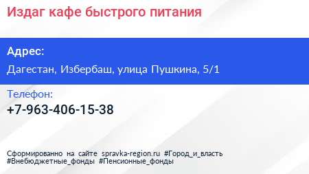 Издаг, кафе быстрого питания по адресу Дагестан, Избербаш, улица Пушкина, 5/1 в дальнейшем Организация, размещена в следующих категориях: