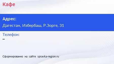 Кафе по адресу Дагестан, Избербаш, Р.Зорге, 31 в дальнейшем Организация, размещена в следующих категориях: