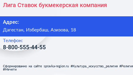 Лига Ставок, букмекерская компания по адресу Дагестан, Избербаш, Азизова, 18 в дальнейшем Организация, размещена в следующих категориях: