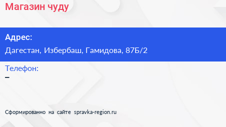 Магазин чуду по адресу Дагестан, Избербаш, Гамидова, 87Б/2 в дальнейшем Организация, размещена в следующих категориях: