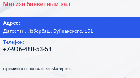 Матиза, банкетный зал по адресу Дагестан, Избербаш, Буйнакского, 151 в дальнейшем Организация, размещена в следующих категориях: