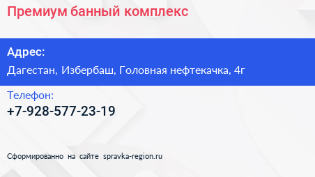 Премиум, банный комплекс по адресу Дагестан, Избербаш, Головная нефтекачка, 4г в дальнейшем Организация, размещена в следующих категориях: