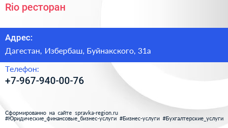 Rio, ресторан по адресу Дагестан, Избербаш, Буйнакского, 31а в дальнейшем Организация, размещена в следующих категориях: