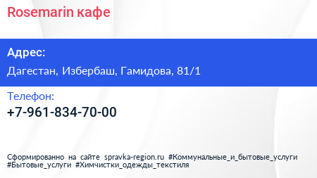 Rosemarin, кафе по адресу Дагестан, Избербаш, Гамидова, 81/1 в дальнейшем Организация, размещена в следующих категориях: