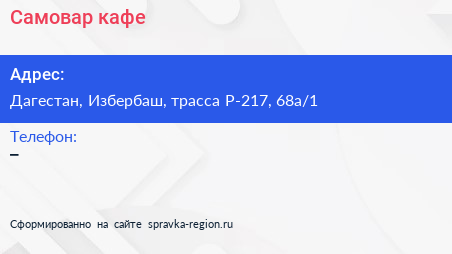Самовар, кафе по адресу Дагестан, Избербаш, трасса Р-217, 68а/1 в дальнейшем Организация, размещена в следующих категориях: