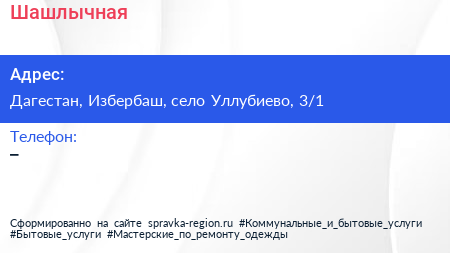 Шашлычная по адресу Дагестан, Избербаш, село Уллубиево, 3/1 в дальнейшем Организация, размещена в следующих категориях:
