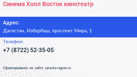 Синема Холл Восток, кинотеатр по адресу Дагестан, Избербаш, проспект Мира, 1 в дальнейшем Организация, размещена в следующих категориях: