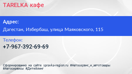 TARELKA, кафе по адресу Дагестан, Избербаш, улица Маяковского, 115 в дальнейшем Организация, размещена в следующих категориях: