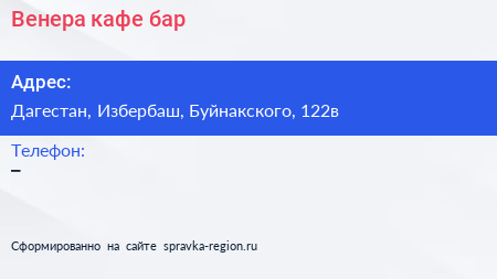 Венера, кафе-бар по адресу Дагестан, Избербаш, Буйнакского, 122в в дальнейшем Организация, размещена в следующих категориях:
