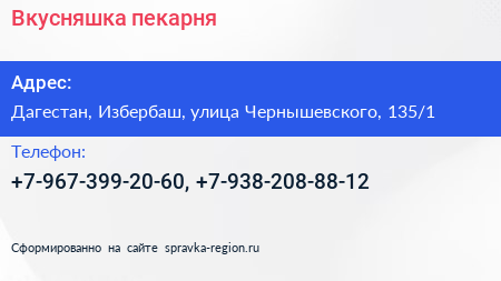 Вкусняшка, пекарня по адресу Дагестан, Избербаш, улица Чернышевского, 135/1 в дальнейшем Организация, размещена в следующих категориях: