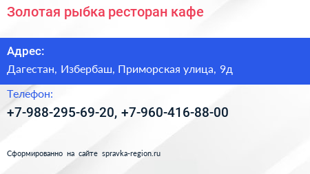 Золотая рыбка, ресторан-кафе по адресу Дагестан, Избербаш, Приморская улица, 9д в дальнейшем Организация, размещена в следующих категориях: