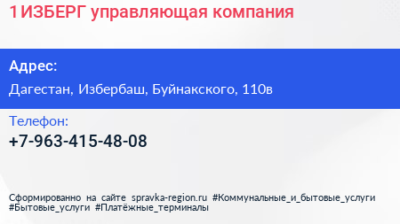 1 ИЗБЕРГ, управляющая компания по адресу Дагестан, Избербаш, Буйнакского, 110в в дальнейшем Организация, размещена в следующих категориях: