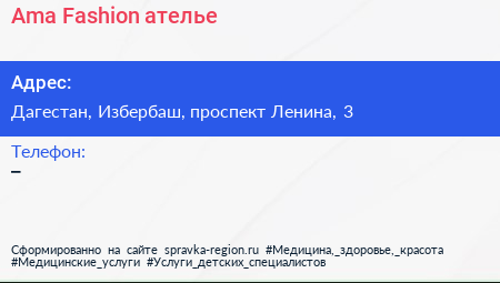 Ama Fashion, ателье по адресу Дагестан, Избербаш, проспект Ленина, 3 в дальнейшем Организация, размещена в следующих категориях: