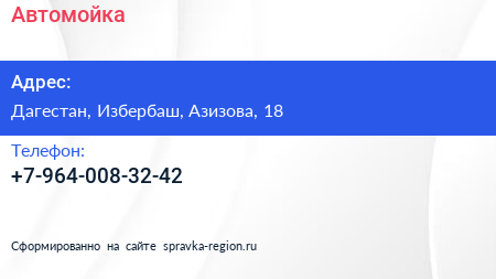 Автомойка по адресу Дагестан, Избербаш, Азизова, 18 в дальнейшем Организация, размещена в следующих категориях: