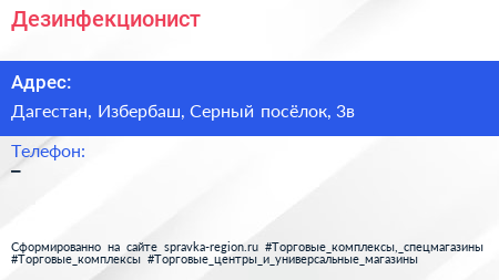 Дезинфекционист по адресу Дагестан, Избербаш, Серный посёлок, 3в в дальнейшем Организация, размещена в следующих категориях: