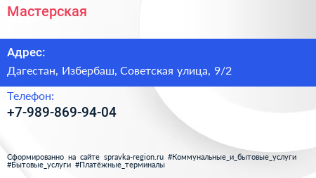 Мастерская по адресу Дагестан, Избербаш, Советская улица, 9/2 в дальнейшем Организация, размещена в следующих категориях: