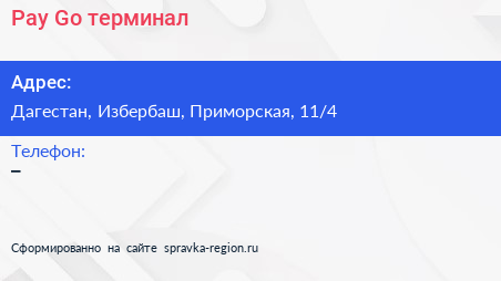 Pay-Go, терминал по адресу Дагестан, Избербаш, Приморская, 11/4 в дальнейшем Организация, размещена в следующих категориях: