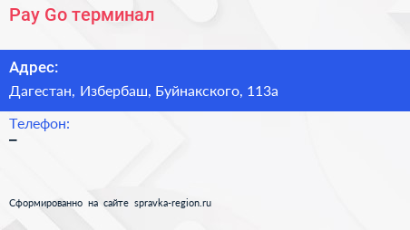 Pay-Go, терминал по адресу Дагестан, Избербаш, Буйнакского, 113а в дальнейшем Организация, размещена в следующих категориях: