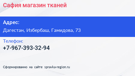 Сафия, магазин тканей по адресу Дагестан, Избербаш, Гамидова, 73 в дальнейшем Организация, размещена в следующих категориях: