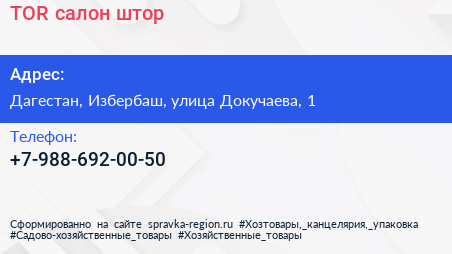 TOR, салон штор по адресу Дагестан, Избербаш, улица Докучаева, 1 в дальнейшем Организация, размещена в следующих категориях: