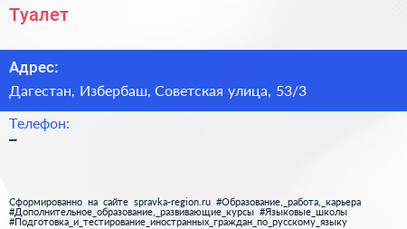 Туалет по адресу Дагестан, Избербаш, Советская улица, 53/3 в дальнейшем Организация, размещена в следующих категориях: