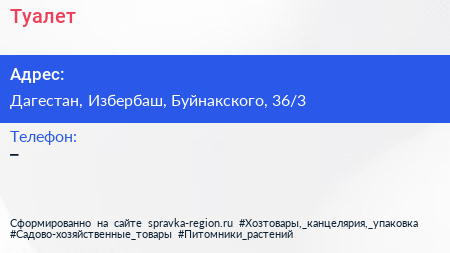 Туалет по адресу Дагестан, Избербаш, Буйнакского, 36/3 в дальнейшем Организация, размещена в следующих категориях: