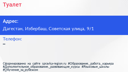 Туалет по адресу Дагестан, Избербаш, Советская улица, 9/1 в дальнейшем Организация, размещена в следующих категориях: