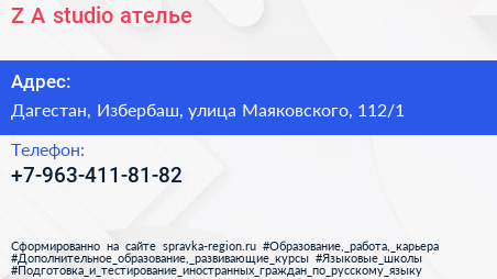 Z A studio, ателье по адресу Дагестан, Избербаш, улица Маяковского, 112/1 в дальнейшем Организация, размещена в следующих категориях: