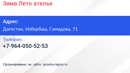 Зима Лето, ателье по адресу Дагестан, Избербаш, Гамидова, 71 в дальнейшем Организация, размещена в следующих категориях: