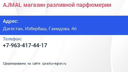 AJMAL, магазин разливной парфюмерии по адресу Дагестан, Избербаш, Гамидова, 46 в дальнейшем Организация, размещена в следующих категориях: