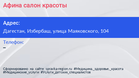 Афина, салон красоты по адресу Дагестан, Избербаш, улица Маяковского, 104 в дальнейшем Организация, размещена в следующих категориях: