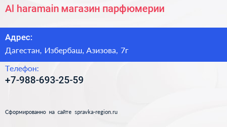 Al-haramain, магазин парфюмерии по адресу Дагестан, Избербаш, Азизова, 7г в дальнейшем Организация, размещена в следующих категориях: