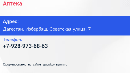Аптека по адресу Дагестан, Избербаш, Советская улица, 7 в дальнейшем Организация, размещена в следующих категориях: