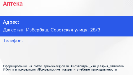 Аптека по адресу Дагестан, Избербаш, Советская улица, 28/3 в дальнейшем Организация, размещена в следующих категориях: