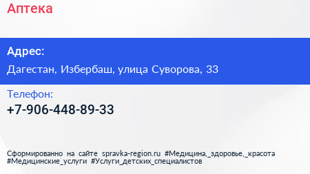Аптека по адресу Дагестан, Избербаш, улица Суворова, 33 в дальнейшем Организация, размещена в следующих категориях: