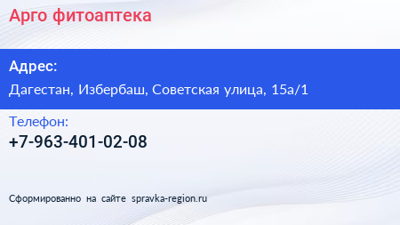 Арго, фитоаптека по адресу Дагестан, Избербаш, Советская улица, 15а/1 в дальнейшем Организация, размещена в следующих категориях: