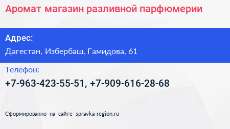 Аромат, магазин разливной парфюмерии по адресу Дагестан, Избербаш, Гамидова, 61 в дальнейшем Организация, размещена в следующих категориях: