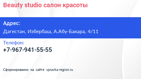 Beauty studio, салон красоты по адресу Дагестан, Избербаш, А.Абу-Бакара, 4/11 в дальнейшем Организация, размещена в следующих категориях: