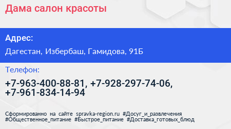 Дама, салон красоты по адресу Дагестан, Избербаш, Гамидова, 91Б в дальнейшем Организация, размещена в следующих категориях:
