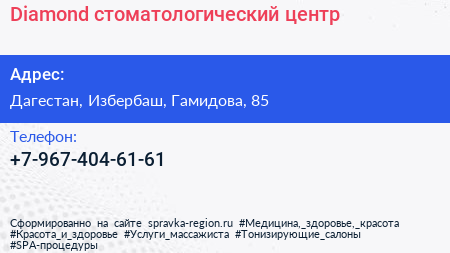 Diamond, стоматологический центр по адресу Дагестан, Избербаш, Гамидова, 85 в дальнейшем Организация, размещена в следующих категориях: