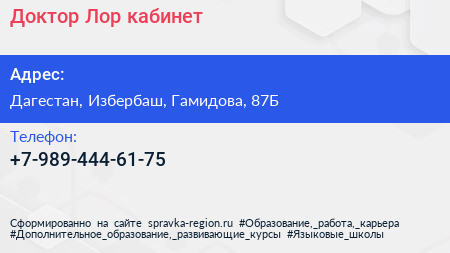 Доктор Лор, кабинет по адресу Дагестан, Избербаш, Гамидова, 87Б в дальнейшем Организация, размещена в следующих категориях: