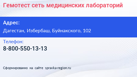 Гемотест, сеть медицинских лабораторий по адресу Дагестан, Избербаш, Буйнакского, 102 в дальнейшем Организация, размещена в следующих категориях: