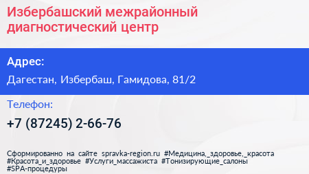 Избербашский межрайонный диагностический центр по адресу Дагестан, Избербаш, Гамидова, 81/2 в дальнейшем Организация, размещена в следующих категориях: