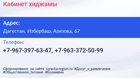 Кабинет хиджамы по адресу Дагестан, Избербаш, Азизова, 67 в дальнейшем Организация, размещена в следующих категориях: