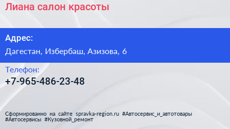 Лиана, салон красоты по адресу Дагестан, Избербаш, Азизова, 6 в дальнейшем Организация, размещена в следующих категориях: